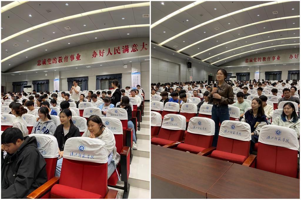 讲座伊始,刘兵老师通过轻松有趣的互动游戏迅速拉近了新生之间的距离,活跃了现场氛围。同学们从初时的拘谨逐渐转为踊跃参与,积极举手互动,现场掌声与欢笑声此起彼伏。游戏结束后,刘老师还为积极参与的同学送上了特别准备的笔记本和定制书签——上面印有实用的心理健康小贴士,既是对同学们热情参与的鼓励,也于细微处传递出心理关怀的温暖。