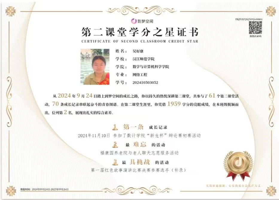 宿舍成员们将服务热情从校园延伸到社会。他们积极投身各类志愿服务活动,累计最高志愿时长达到189小时。从志愿服务到大型赛会,从关爱留守儿童到服务献血站,他们用脚步丈量责任,用行动温暖社会。与此同时,他们在第二课堂活动中同样表现卓越,最高累计积分高达1959分,在学术竞赛、文体活动、社会实践等多个领域斩获佳绩,实现了知识积累与实践能力的双重提升。